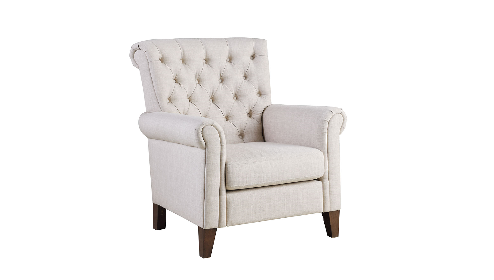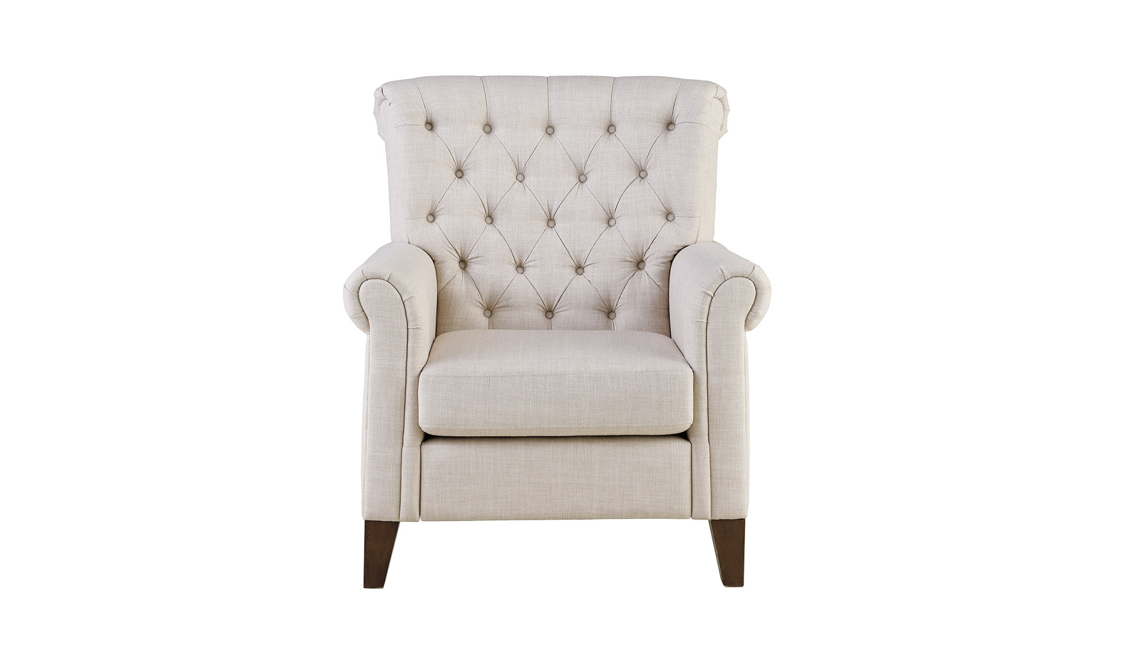 Complete your living room look with this inviting tufted lined armchair that is perched atop four tapered feet. This piece features deep seating, combined with thick padding in the back and seat, and is adorned with buttons. This is sure to be a piece that offers style and comfort.